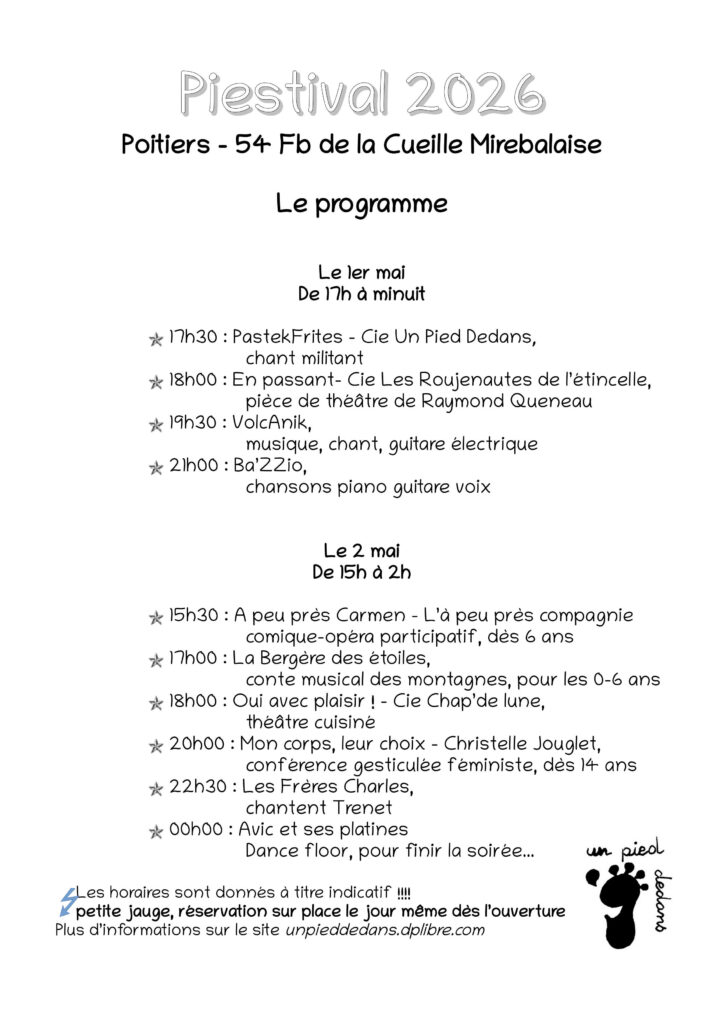 Depuis 2023, Un Pied Dedans organise un festival à Poitiers, chez l’habitant, sur 2 jours au mois de mai : le Piestival. L’occasion pour nous de présenter nos spectacles et d’inviter des groupes et compagnies qui nous tiennent à coeur.