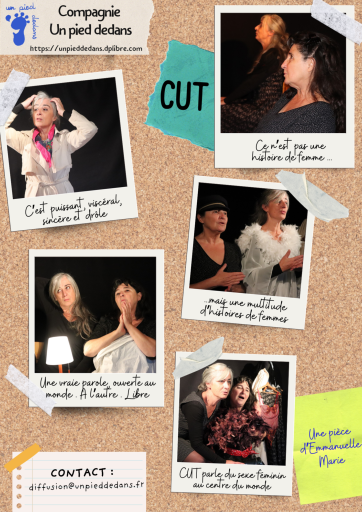 CUT parle de sexe, du sexe féminin, le sexe de la femme au centre du monde. CUT n’est pas une histoire de femme mais une multitude d’histoires de femmes qui se livrent et s’interrogent sur ce sexe qui les constitue et les relie au monde, à la société, aux hommes… C’est puissant, viscéral, sincère et drôle. Une vraie parole, ouverte au monde. A l’autre. Libre.